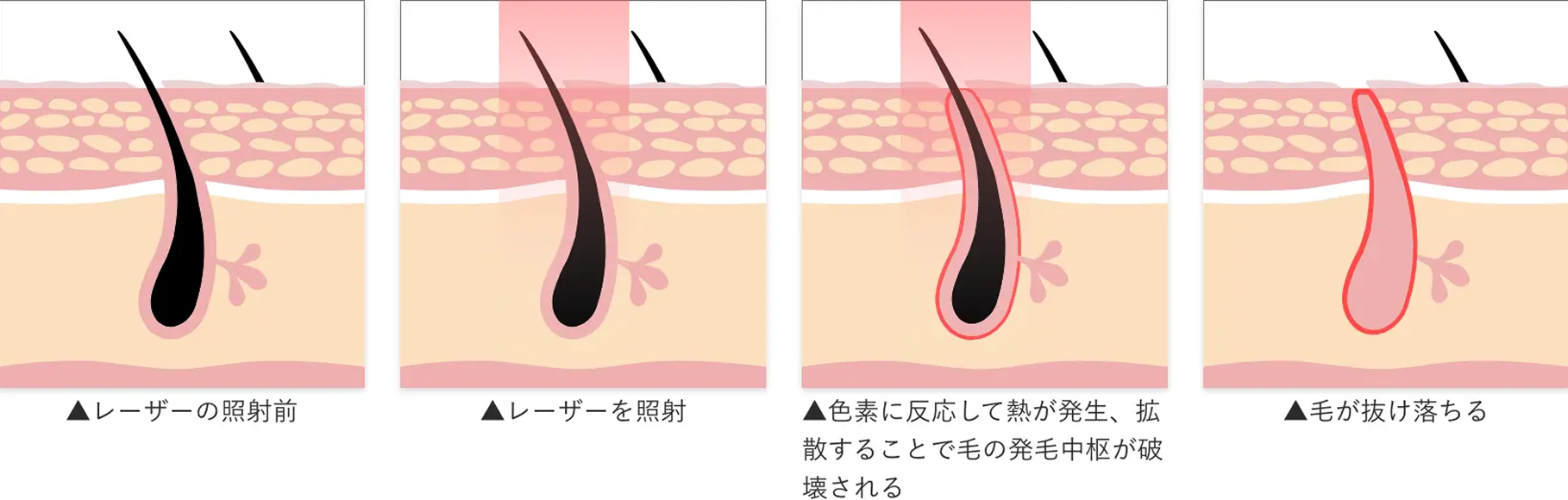 弱いレーザー光を断続的に照射することで、ほんのり温かい熱が徐々に蓄積され、表皮や毛幹の炎症が少なくなります。
